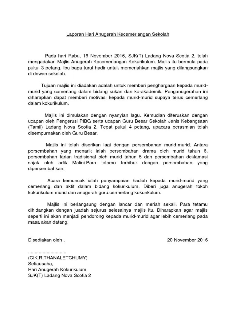 Secara tidak langsung, penglibatan pelajar dalam bidang sukan juga dapat mengharumkan nama sekolah ke seluruh negara. Contoh laporan berformat format karangan jenis laporan karangan jenis ini menghendaki anda melaporkan sesuatu peristiwa yang didengar. Contoh karangan sambutan hari guru.